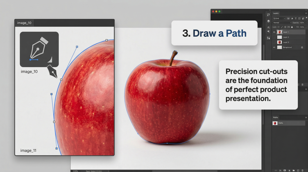 Choose the pen tool from the toolbar on the left-side navigation menu and trace a path along the object’s edge. Once the path is complete, eliminate the image’s background.