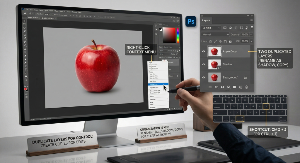 Don’t forget to duplicate this layer as well to work on the shadow. You can rename the first duplicate layer with ‘Shadow’ and the second one with another name you like. It’s completely optional for a better understanding.