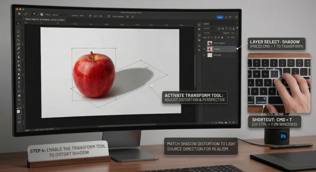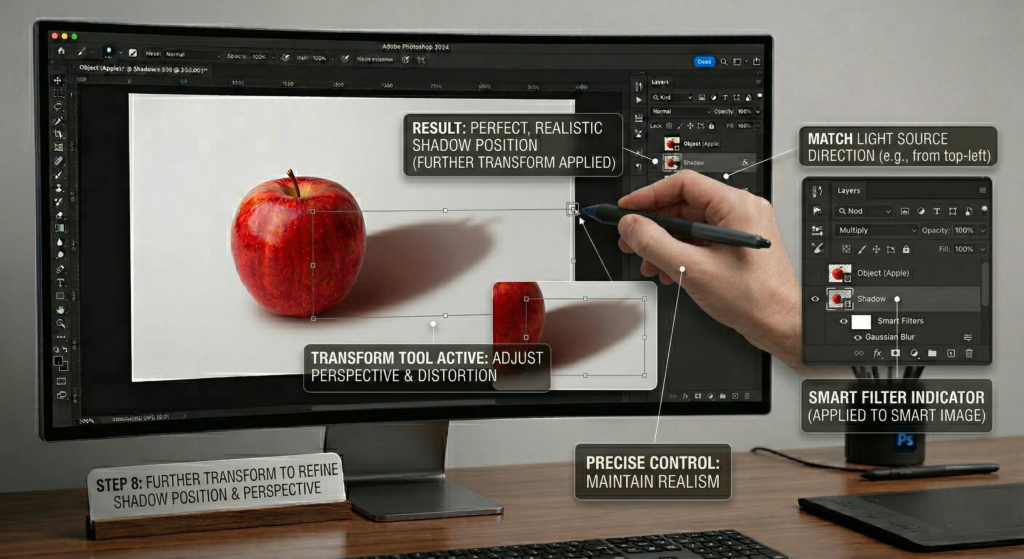 It’s time to refine and further change your shadow using the Transform tool once more. Take time and be careful to consider the position and angle of the light source in your image and adjust the shadow accordingly to maintain a realistic effect. While it’s natural to make mistakes during this process, don’t worry—there is plenty of opportunity to correct any errors through careful adjustments. Always remember that the goal is to keep the shadow subtle and believable, ensuring it enhances the overall realism of your product photo without overwriting.