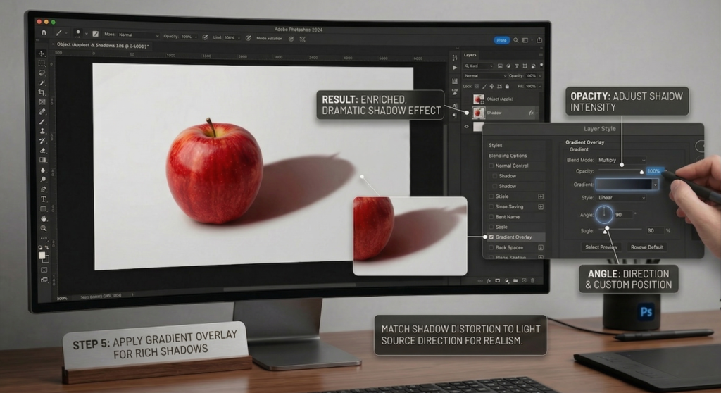 At this point, double-click on the Shadow layer to open the Gradient Overlay settings. This will allow you to modify the color of your transformed image, enriching the shadow effect for a more dramatic appearance. Furthermore, you can polish the shadow’s intensity by adjusting the opacity slider and changing its direction and position using the angle option to drop a more customized shadow effect.