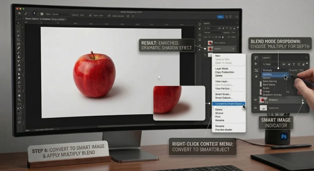 Now, right-click on the Shadow layer in the Layers panel and choose the option to ‘Convert to Smart Object’ from the context menu. After that, click the ‘Blend Mode’ dropdown in the Layers panel and alternate the blending mode to ‘Multiply’ for the desired effect.