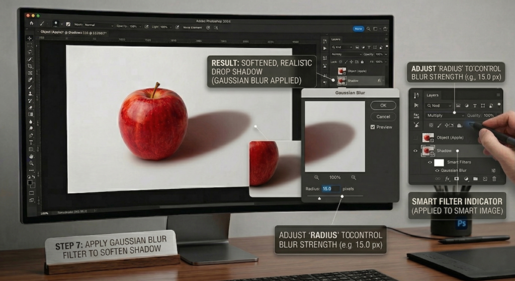 You can go further by proceeding to the “Filter” menu in Photoshop, then selecting “Blur” from the dropdown, followed by “Gaussian Blur” to apply this effect. When the Gaussian blur filter is applied, you should adjust the pixel radius so that you can take control of the strength of the blur.